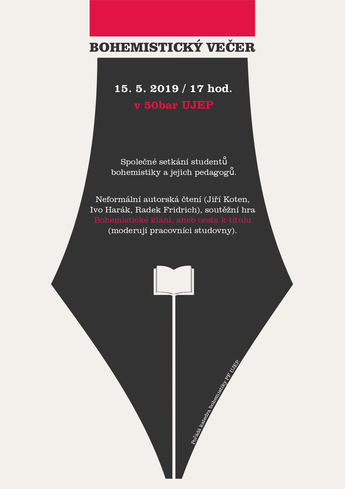 Bohemistický večírek datum: 15. květen 17:00-20:00 místo: 50bar UJEP formát: autorská čtení, soutěžní hra, neformální diskuse pořadatel: KBO cílová skupina: studenti a pedagogové katedry bohemistiky
