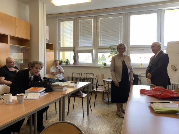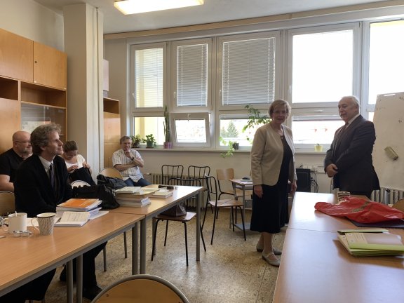 Pak už následovala hodinová přednáška o postavení slovenského jazyka v evropském i světovém prostoru, ale rovněž o současných tendencích, jež ho ohrožují. „Dnes už jsou pro uživatele jazyka vzorem hlavně média, nikoli krásná literatura či divadlo,“ upozornil na neblahý vývoj prof. Ondrejovič, který za své profesní zásluhy získal mnoho ocenění, v roce 2003 například i Medaili prezidenta Slovenské republiky. „Za jazykovědu nelze získat Nobelovu cenu. Ale například ve Velké Británii byli lingvisté povýšeni do šlechtického stavu,“ uvedl prof. Ondrejovič a v následné diskusi už odpovídal i na zvídavé dotazy přítomných pracovníků katedry a studentů. Děkujeme tímto za inspirativní návštěvu a zdravíme na Slovensko!