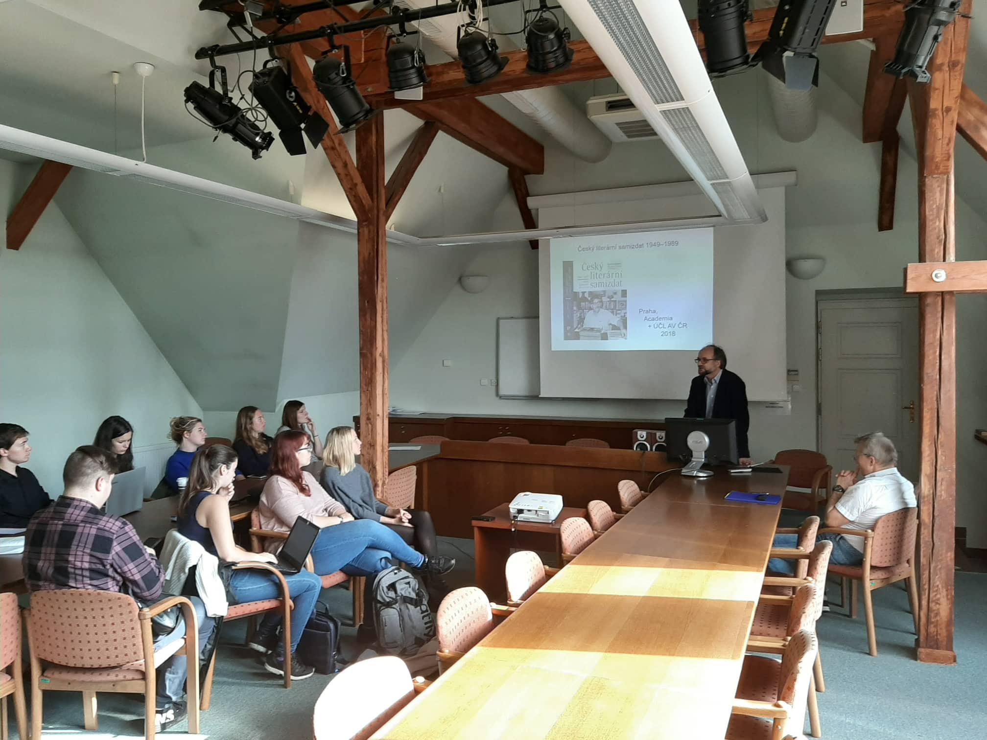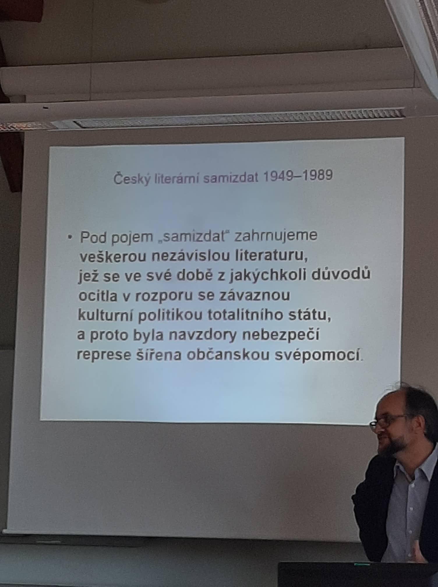 Na pozvání Katedry bohemistiky PF UJEP navštívil 10. 10. 2019 Ústí nad Labem prozaik a literární historik (mj. náš přední znalec tvorby Josefa Škvoreckého a české nezávislé literatury) Michal Přibáň z Ústavu pro českou literaturu Akademie věd České republiky. Sám název přednášky – Jak vznikala encyklopedie Český literární samizdat – velmi přesně specifikuje tematické zaměření akce, určené zejména doktorandům a studentům výše uvedené katedry. PhDr. Michal Přibáň, Ph.D. byl totiž vedoucím autorského kolektivu, který se podílel na vzniku naší zatím nejobsáhlejší encyklopedie zachycující nezávislé publikační iniciativy v letech 1949 – 1989 (Český literární samizdat 1949 – 1989) . Přednáška se ukázala být nejen vhodným předznamenáním oslav 17. listopadu 1989, ale také stejně informačně bohatým jako osobně zaujatým svědectvím literárního vědce i přímého účastníka. Studenti měli možnost nahlédnout do časů, v níž autorům stojícím v nemilosti mocných namísto internetu zbývá toliko psací stroj a průklepový papír a uměnímilovný i svobodomyslný čtenář obětuje spánek proto, aby horlivě četl a ještě horlivěji opisoval texty zapovězených tvůrců. Ale možná ještě dobrodružněji vyzněly (v podání Přibáňově) nedávné cesty za rekonstrukcí podoby naší ineditní literatury; která je – v nejvyšší možné úplnosti – představena v Přibáněm redigované knize. Obsáhlá (i kuloárová) diskuse ukázala, nakolik je téma jen zdánlivě úzké a odtažité živě přítomno také v našich současných úvahách.