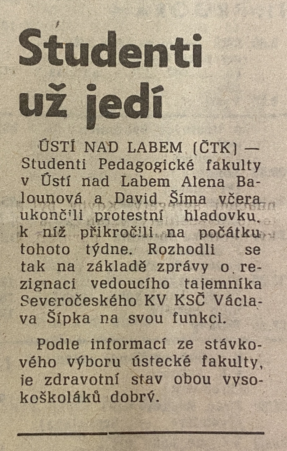 ÚSTÍ NAD LABEM (ČTK) Studenti Pedagogické fakulty v Ústí nad Labem Alena Balounová a David Šíma včera ukončili protestní hladovku, k níž přikročili na počátku tohoto týdne. Rozhodli se tak na základě zprávy o rezignaci vedoucího tajemníka Severočeského KV KSČ Václava Šípka na svou funkci. Podle informací ze stávkového výboru ústecké fakulty, je zdravotní stav obou vysokoškoláků dobrý.