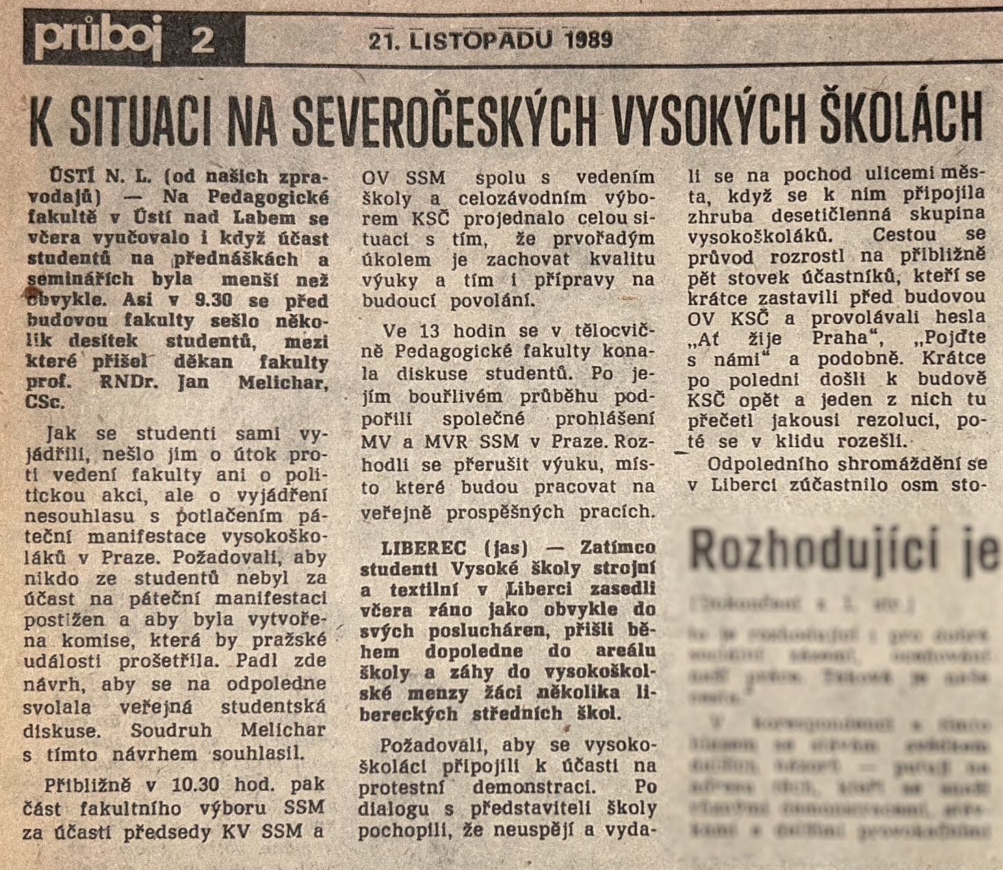 ÚSTÍ N. L. (od našich zpravodajů) Na Pedagogické fakultě v Ústí nad Labem se včera vyučovalo i když účast studentů na přednáškách a seminářích byla menší než obvykle. Asi v 9.30 se před budovou fakulty sešlo několik desítek studentů, mezi kterými byl i děkan fakulty prof. RNDr. Jan Melichar, CSc.