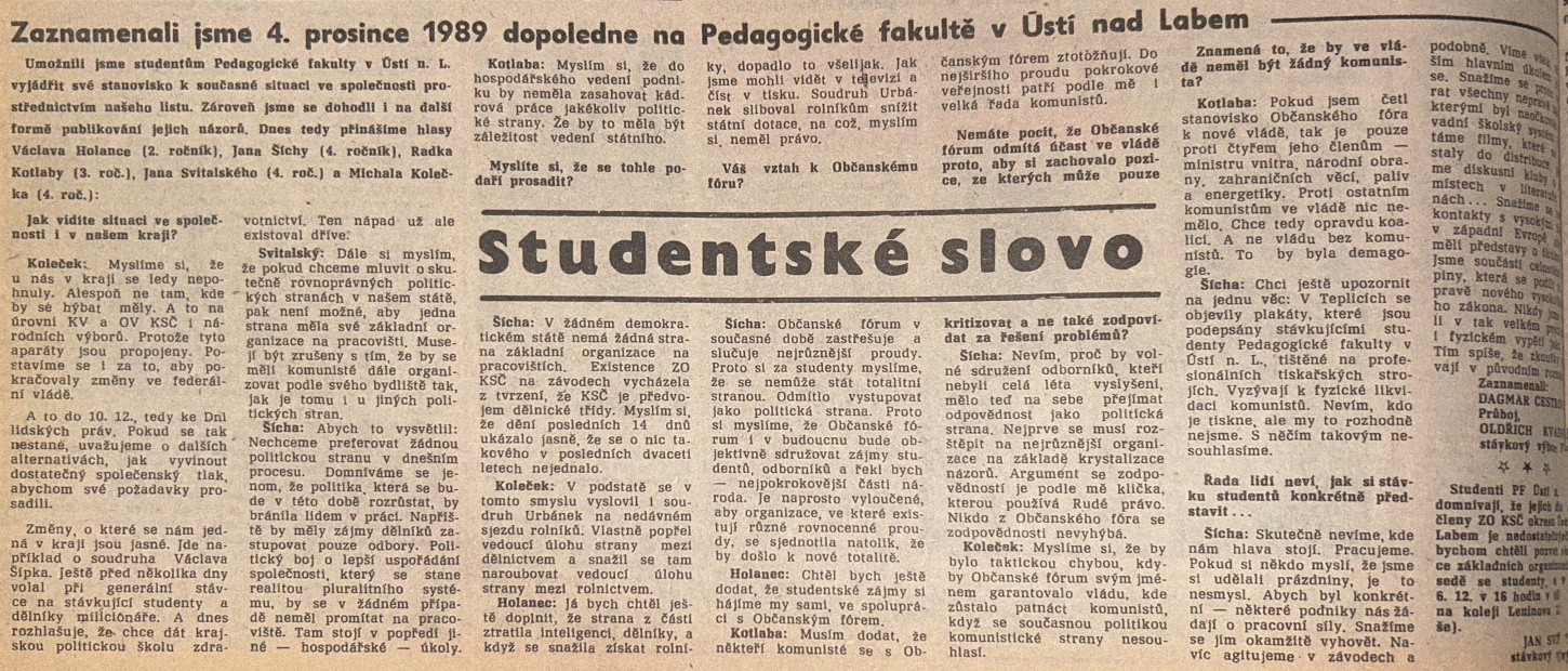 Umožnili jsme studentům Pedagogické fakulty v Ústí n. Labem vyjádřit své stanovisko k současné situaci ve společnosti prostřednictvím našeho listu. Zároveň jsme se dohodli i na další formě publikování jejich názorů. Dnes tedy přinášíme hlasy Václava Holance (2. ročník), Jana Sichy (4. ročník), Radka Kotlaby (3. roč.), Jana Svitalského (4. roč.) a Michala Kolečka (4. roč.):