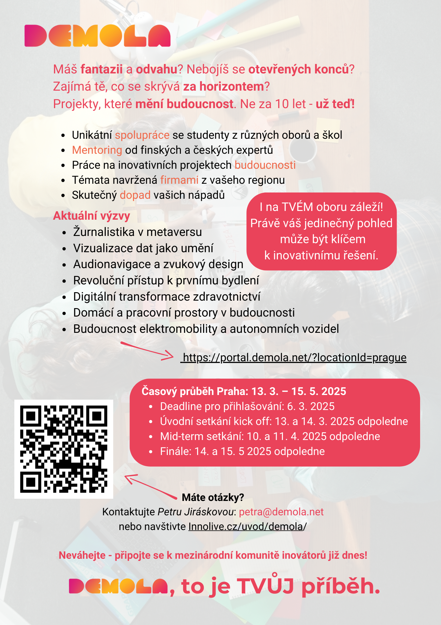 QR kód na plakátu vede na Českou stránku naší firmy Innolive, která Demolu v Česku pomáhá šířit. https://innolive.cz/uvod/demola/ Na té stránce je i tříminutová ozvučená prezentace, kde říkáme, o co jde a jak vše funguje (pouze je tam původní deadline 2.3.). Po kliknutí na termíny se ukážou termíny a další video se studentem, který už Demolou prošel. Po kliknutí na projekty už se dostanete na stránku Demoly v angličtině https://portal.demola.net/?locationId=prague